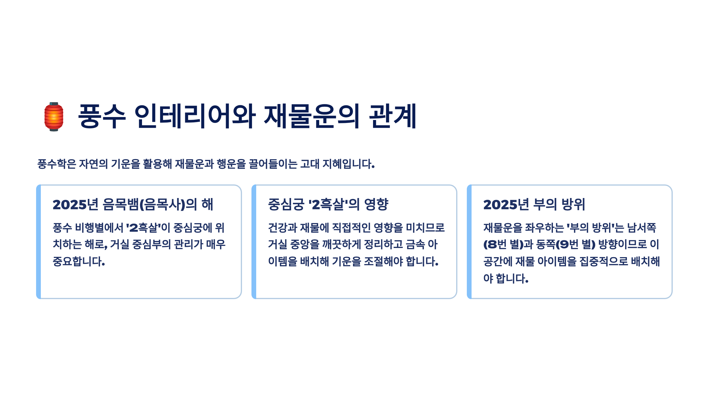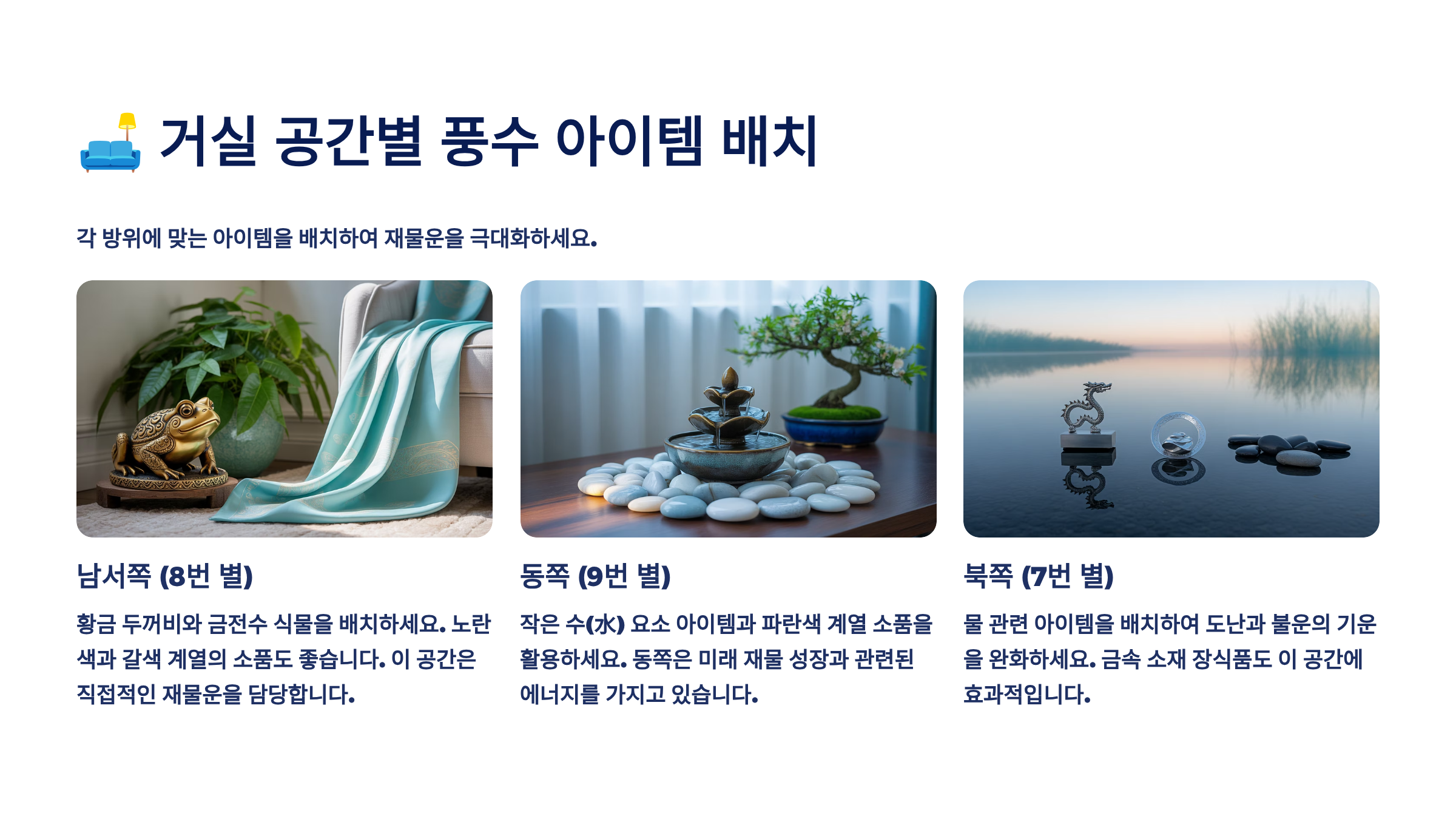 본 콘텐츠는 전통 풍수 이론과 현대 인테리어를 접목한 정보 제공을 목적으로 작성되었습니다. 풍수는 문화적 신념 체계로서 과학적으로 입증되지 않은 부분이 있으며, 개인의 신념과 해석에 따라 효과가 다를 수 있습니다. 재물운 상승을 보장하지 않으며, 중요한 재정 결정은 전문가와 상담하시기 바랍니다. 풍수 아이템 구매 시 신중하게 판단하시고, 과도한 투자는 피하시기 바랍니다.