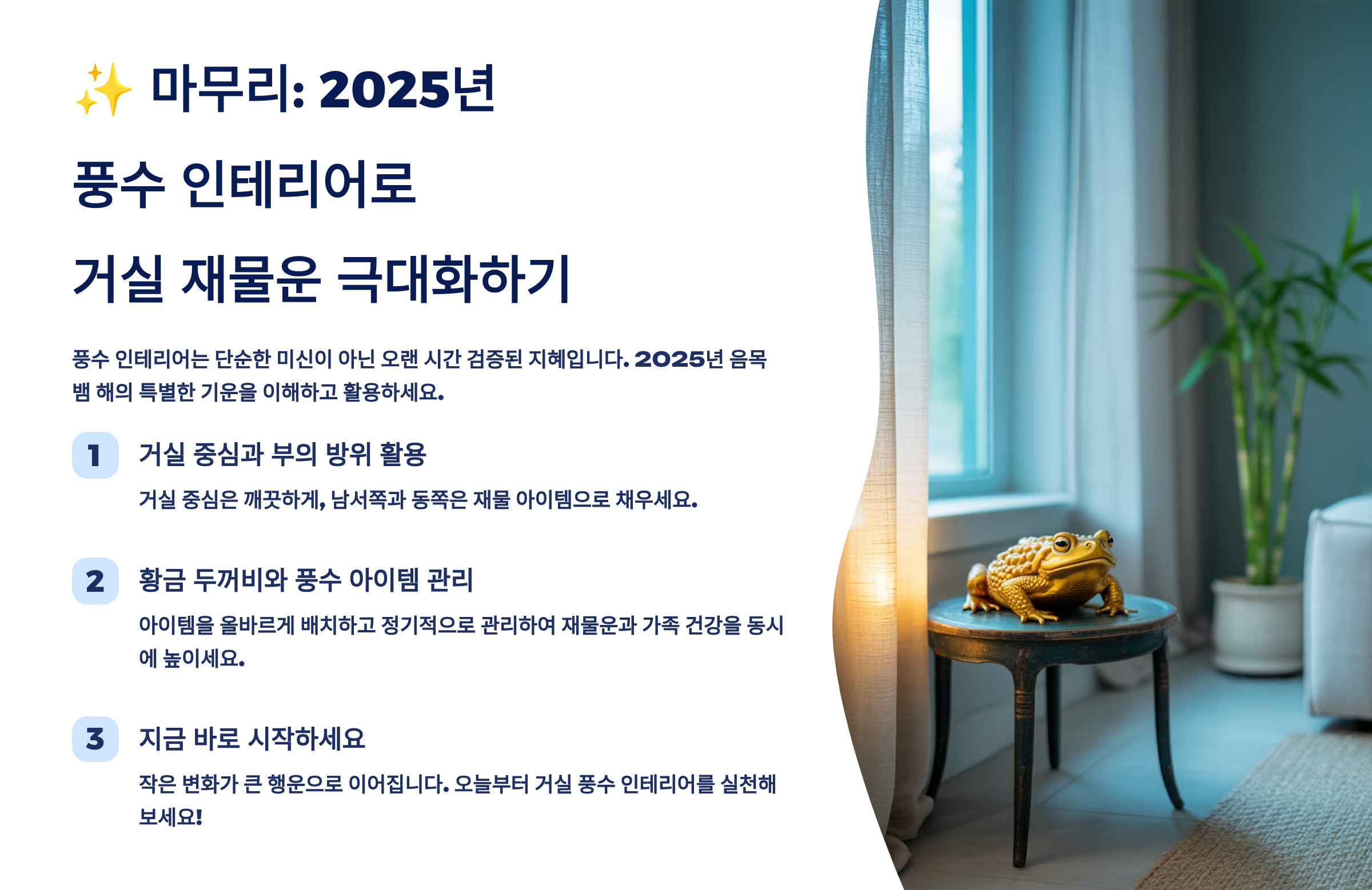 지금까지 거실 재물 방위와 황금 두꺼비를 중심으로 풍수 인테리어의 모든 것을 알아봤어요. 풍수는 단순한 미신이 아니라 오랜 세월 검증된 공간 철학이에요. 좋은 기운이 흐르는 공간에서 생활하면 자연스럽게 긍정적인 마음과 좋은 기회가 찾아온답니다. 2025년 을사년, 여러분의 거실이 재물이 샘솟는 명당이 되기를 진심으로 바라요! 💎