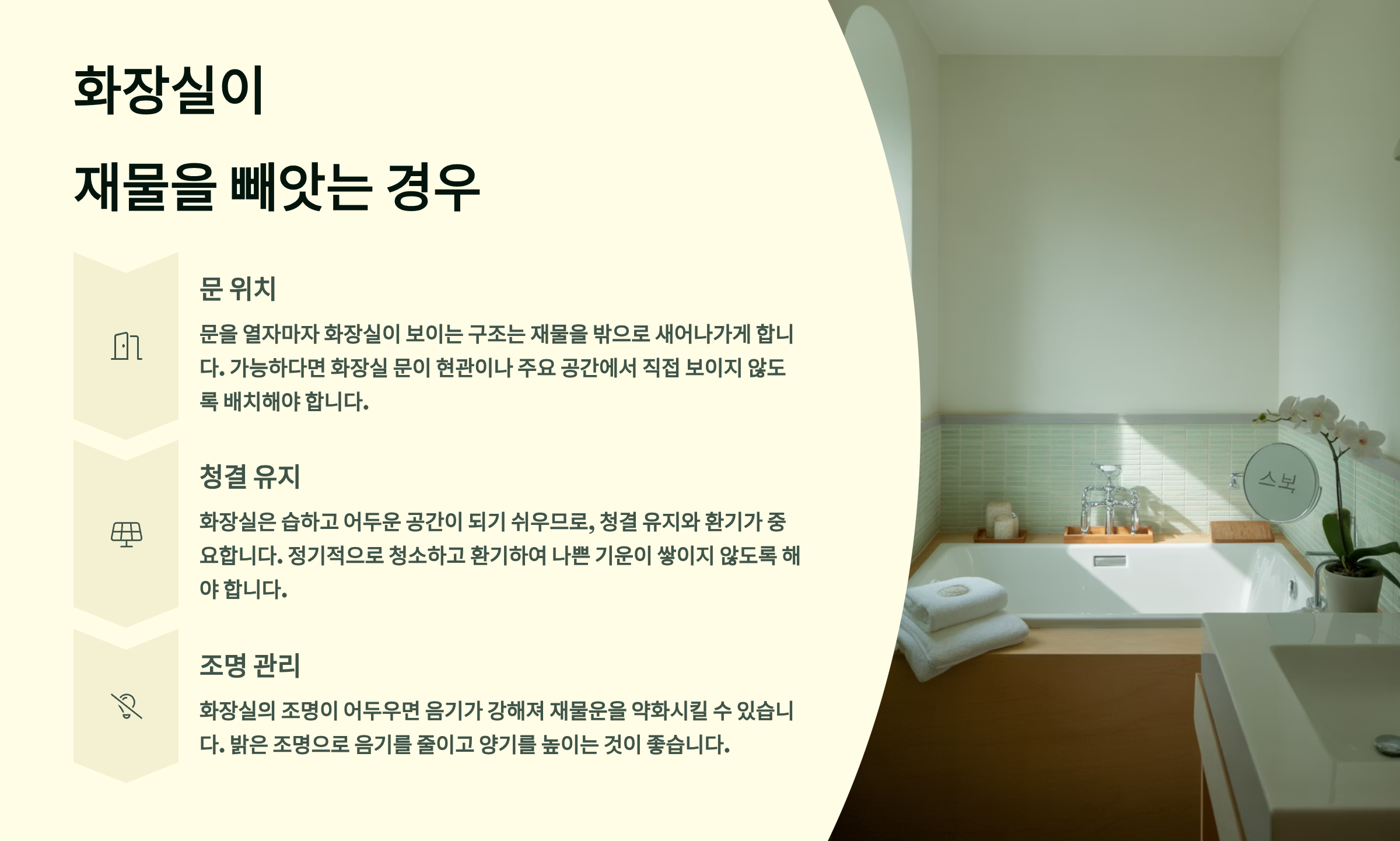 화장실은 풍수에서 가장 조심해야 할 공간 중 하나예요. 물이 계속 흘러나가는 곳이기 때문에 재물도 함께 빠져나간다고 보거든요. 특히 현대 주택에서는 화장실이 집 안쪽에 위치하는 경우가 많아서 더욱 신경 써야 해요. 화장실의 위치와 상태에 따라 가족의 재물운이 크게 좌우될 수 있답니다.