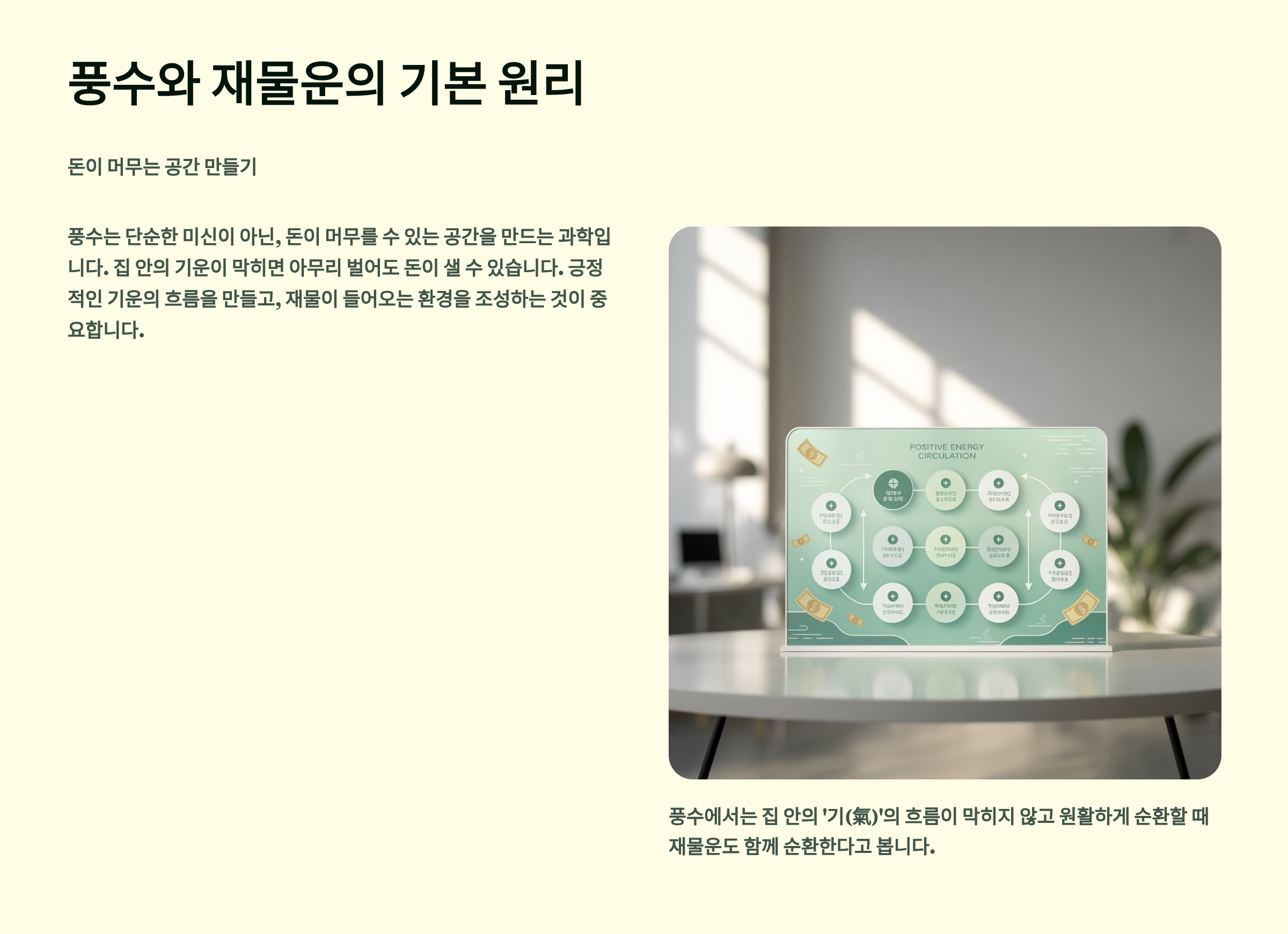 본 콘텐츠는 전통 풍수 이론과 현대적 해석을 바탕으로 작성된 정보성 자료입니다. 풍수는 과학적으로 검증된 이론이 아니며, 개인의 신념과 문화적 배경에 따라 해석이 다를 수 있습니다. 제공된 정보는 참고용이며, 실제 주거 환경 개선이나 인테리어 결정은 개인의 판단과 전문가 상담을 통해 이루어져야 합니다. 풍수 인테리어로 인한 결과는 개인차가 있을 수 있으며, 경제적 이익을 보장하지 않습니다.