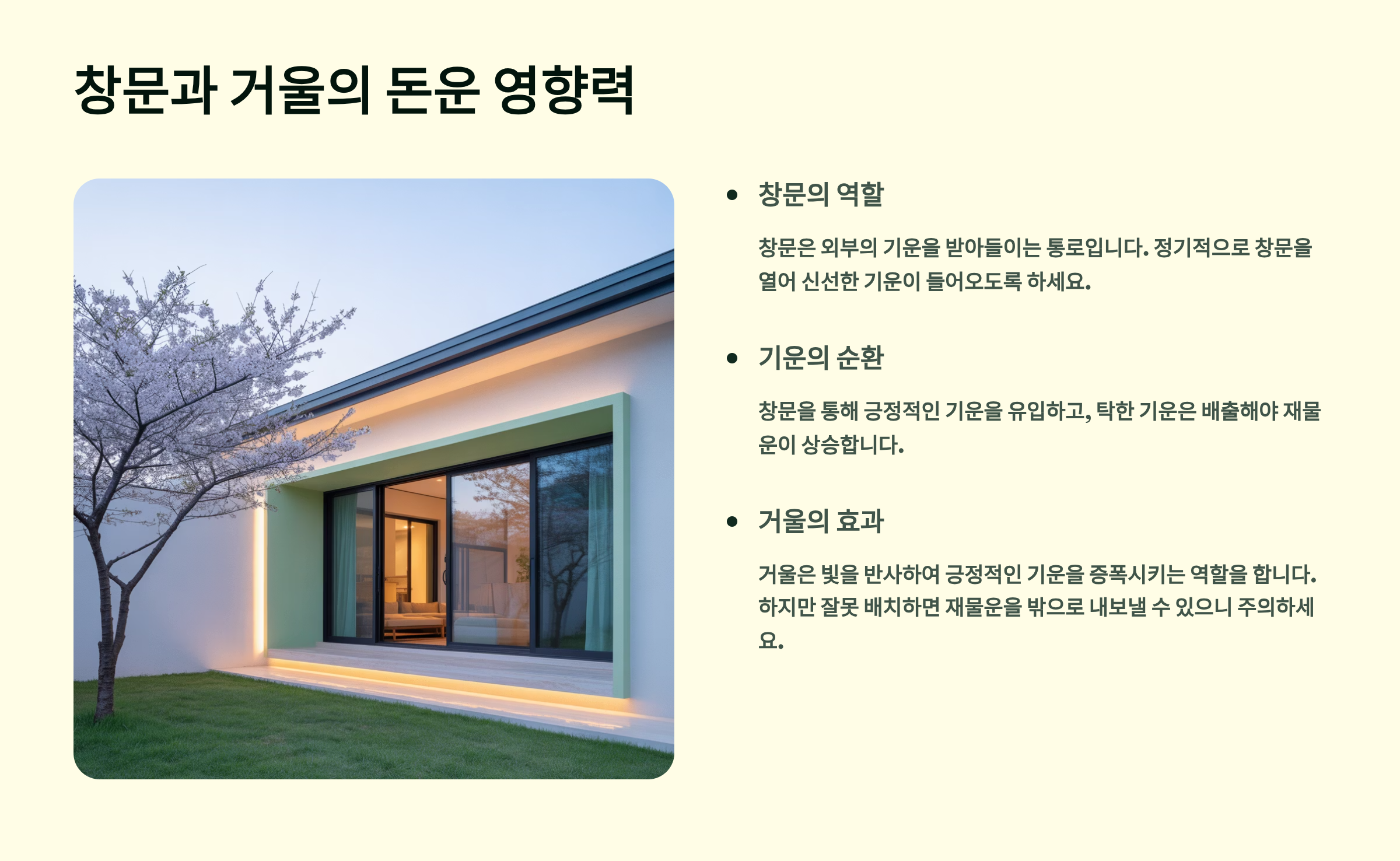 | 기의 순환 | 정기적 환기, 공기청정기 사용 | 금전 에너지 활성화 |