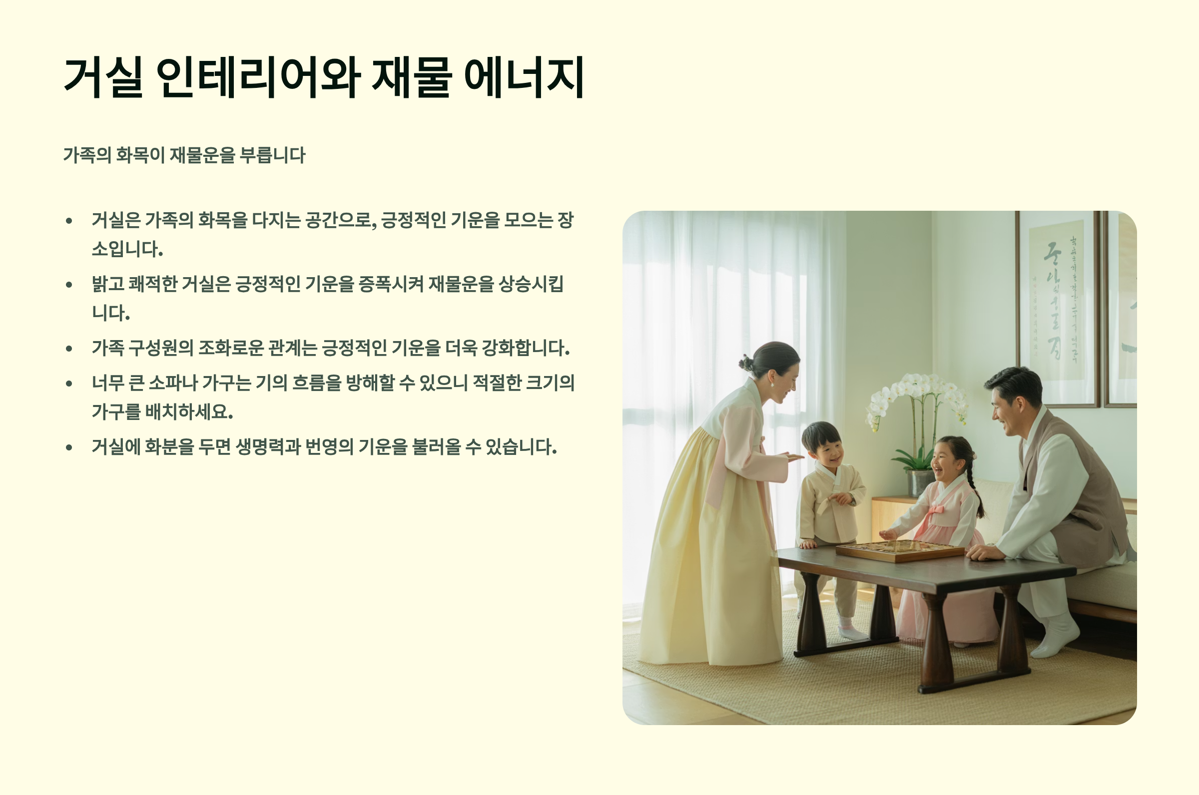 거실에서 가족이 함께 보내는 시간의 질도 재물운과 연결돼요. TV만 보면서 각자 스마트폰을 하는 것보다는, 함께 대화하고 웃으며 시간을 보내는 것이 좋은 기운을 만들어요. 가족 간의 화목한 에너지는 그 자체로 강력한 재물운의 원천이 된답니다. 주말에는 거실에서 가족 게임을 하거나 함께 차를 마시며 대화하는 시간을 가져보세요. 이런 따뜻한 에너지가 쌓이면 자연스럽게 좋은 일들이 생긴답니다! 🏠