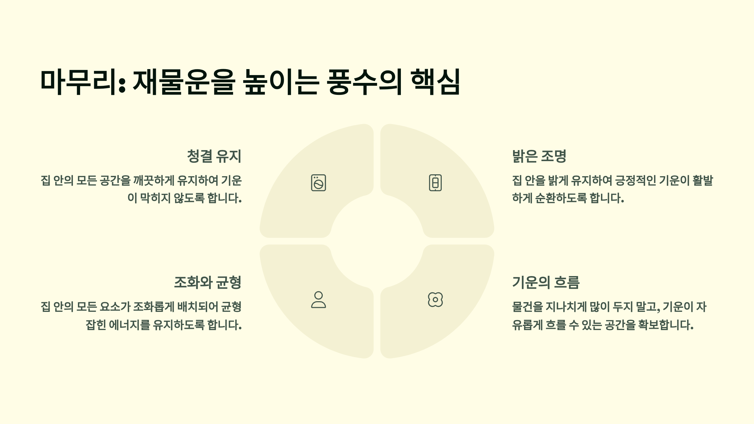 | 풍수 원칙 | 구체적 방법 | 기대 효과 |