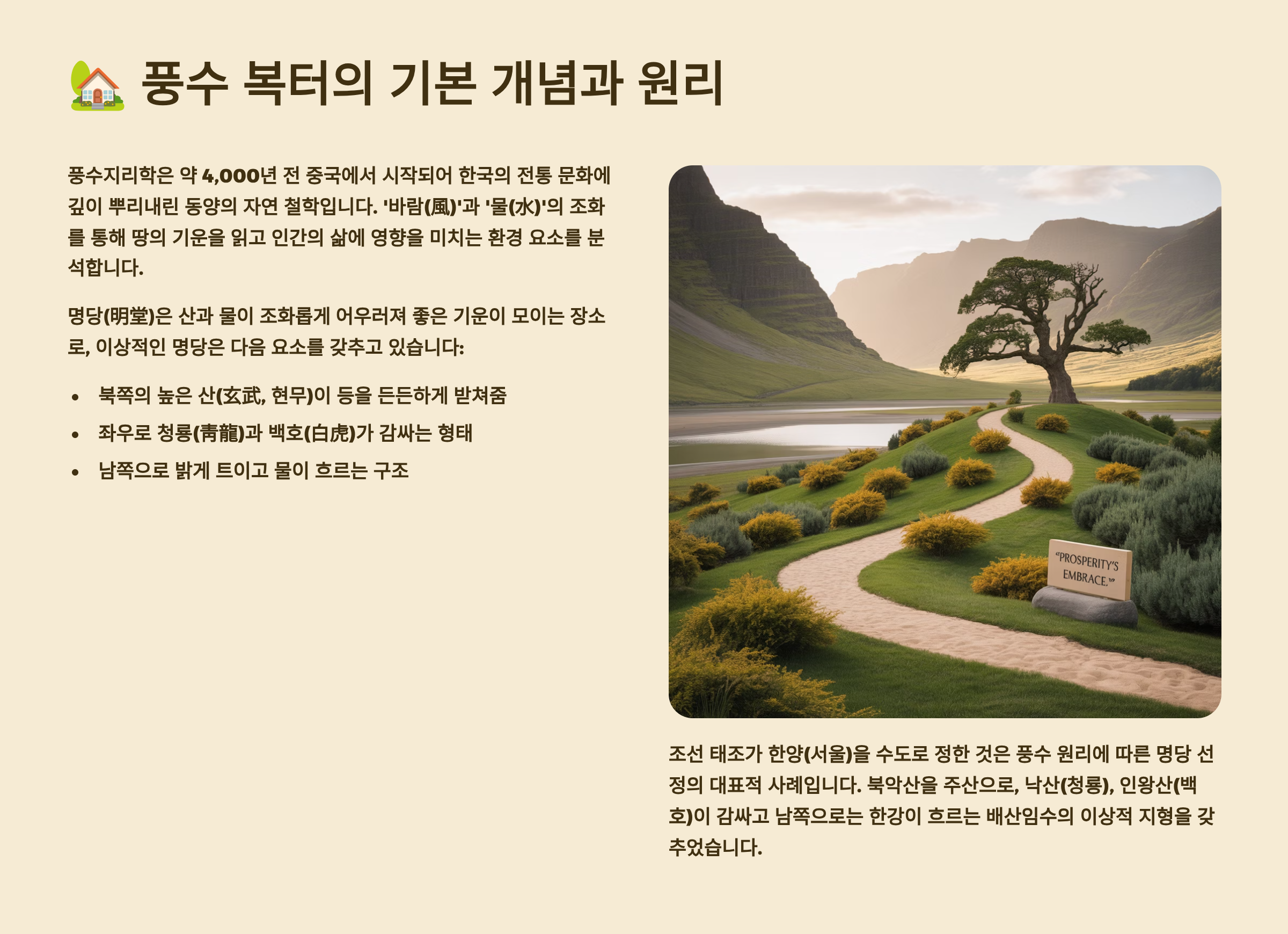 풍수는 수천 년 동안 동양에서 발전해온 환경과 인간의 조화를 추구하는 학문이에요. 특히 한국의 풍수지리학은 산과 물, 바람의 흐름을 읽어 최적의 거주 공간을 찾는 지혜를 담고 있답니다. 오늘날에도 많은 사람들이 집을 구하거나 이사를 갈 때 풍수를 참고하고 있어요.