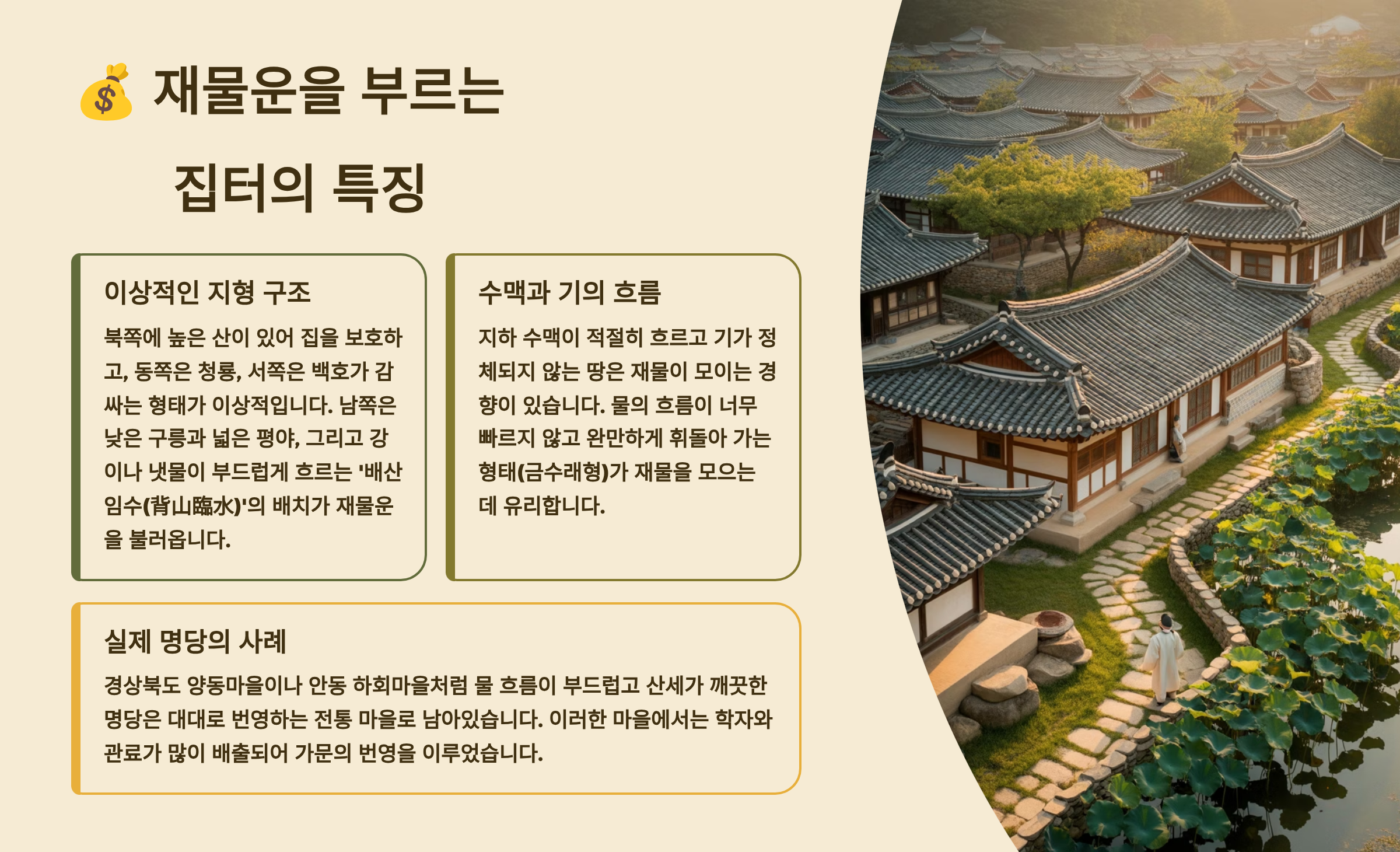 재물운이 좋은 집터는 기본적으로 '수구막이'가 잘 되어 있어야 해요. 수구란 물이 빠져나가는 곳을 말하는데, 이곳이 너무 열려있으면 재물이 새어나간다고 봐요. 집 앞에 작은 언덕이나 나무, 바위 등이 있어 물(기운)이 바로 빠져나가지 않고 잠시 머물렀다 가는 지형이 좋답니다. 현대적으로 해석하면 집 앞에 작은 정원이나 화단이 있어 기운이 순환하는 구조가 이에 해당해요.