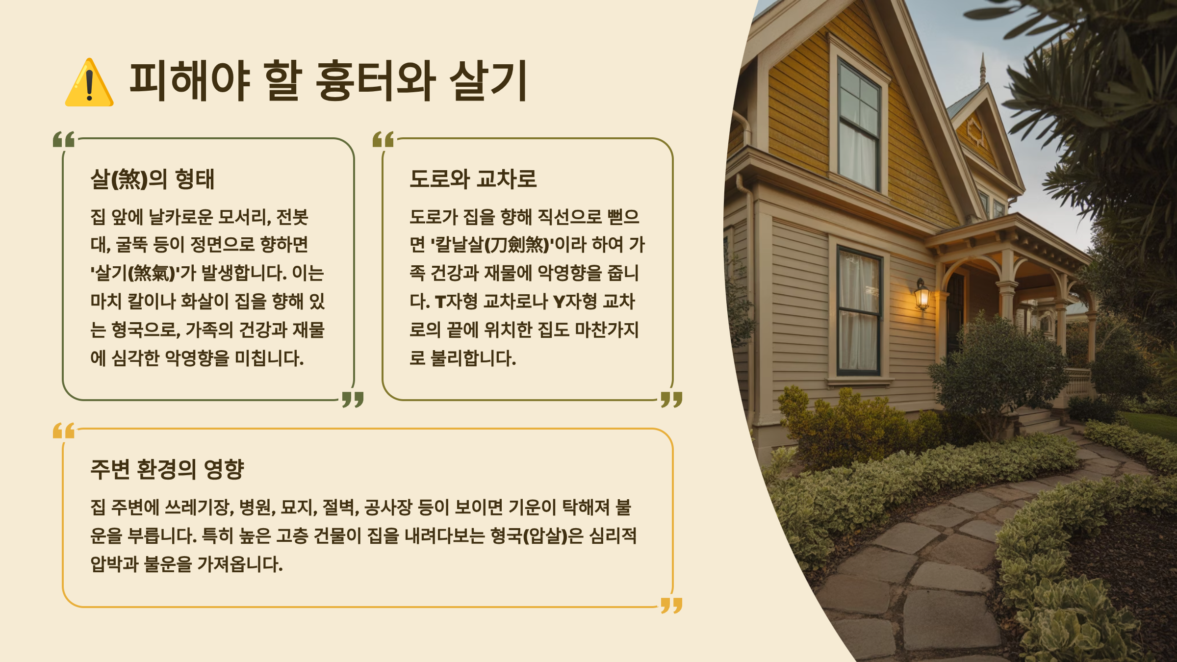 건물의 모서리가 집을 향하고 있는 '각살(角殺)'도 피해야 할 형살이에요. 뾰족한 모서리에서 나오는 날카로운 기운이 집으로 향하면 가족 간의 불화나 건강 문제를 일으킬 수 있다고 봐요. 또한 고압 전선이나 송전탑이 가까이 있는 곳도 전자파와 심리적 압박감으로 인해 좋지 않답니다. 큰 굴뚝이나 공장이 보이는 곳도 공해와 나쁜 기운으로 인해 피하는 것이 좋아요.
