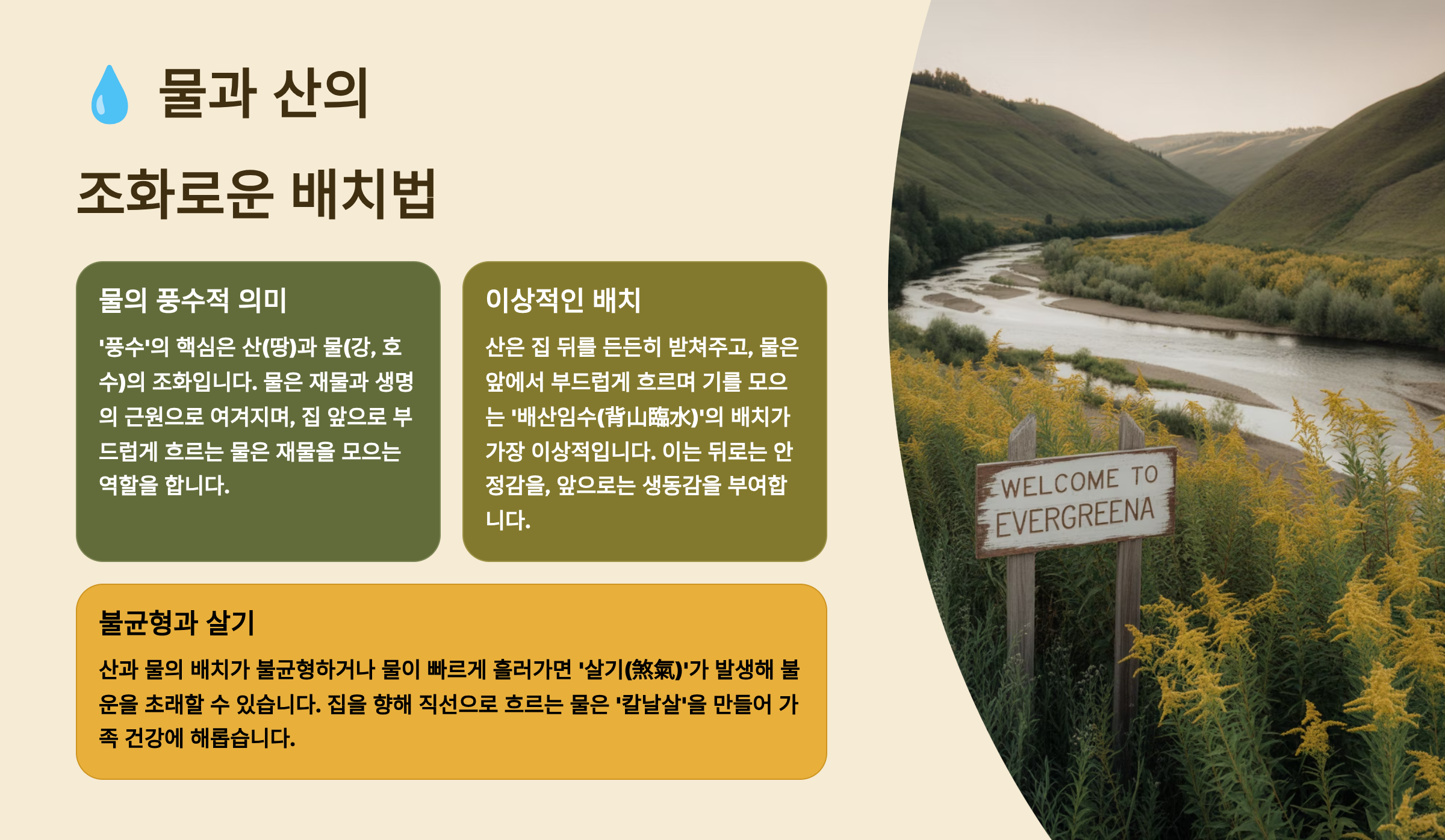 풍수에서 물은 재물과 풍요를 상징하는 중요한 요소예요. '산관인정수관재(山管人丁水管財)'라는 말이 있듯이, 산은 사람과 건강을 관장하고 물은 재물을 관장한다고 봐요. 집 주변에 맑은 물이 있으면 재물운이 좋아지는데, 특히 집을 향해 감싸 안듯이 흐르는 물이 최고로 여겨진답니다. 하지만 물이 너무 가깝거나 빠르게 흐르면 오히려 습기와 소음으로 인해 좋지 않아요.
