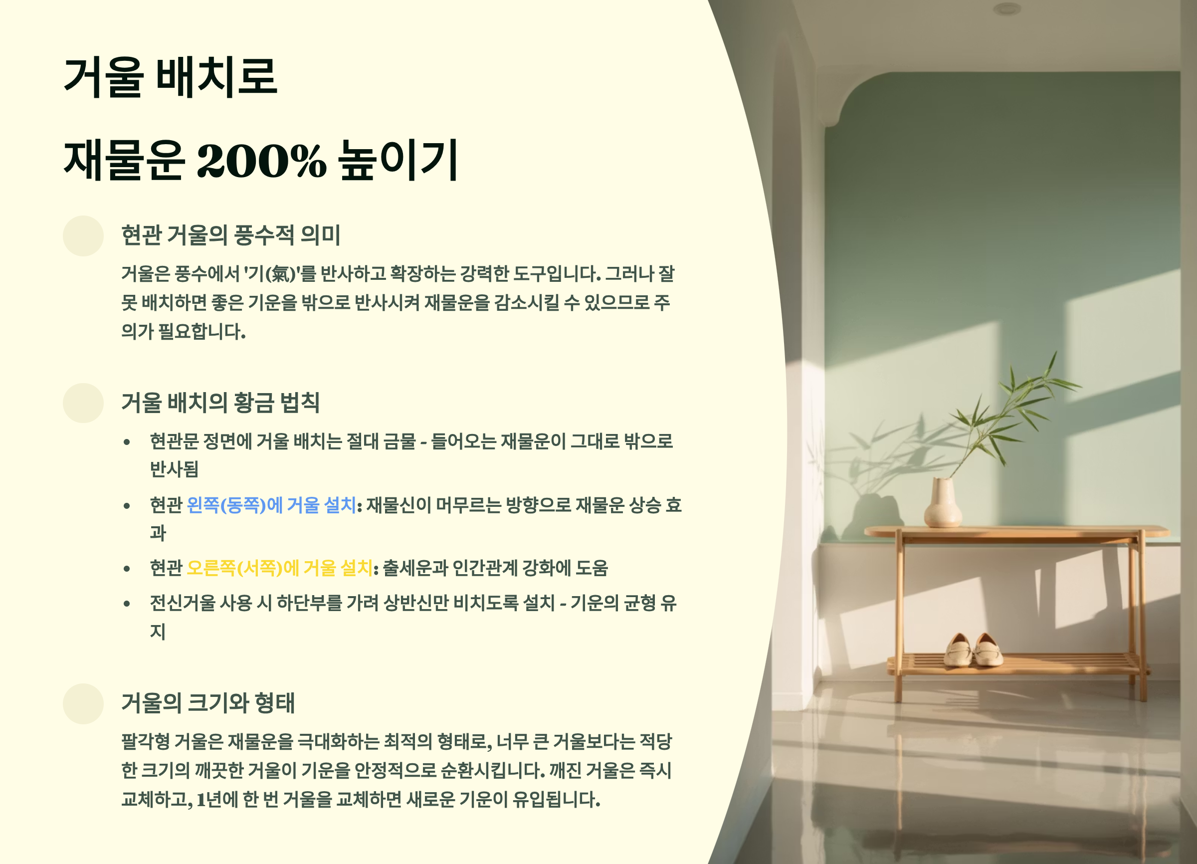 현관 거울은 풍수에서 가장 중요한 아이템 중 하나예요. 거울은 기운을 반사하고 증폭시키는 역할을 하기 때문에 위치가 정말 중요하답니다. 잘못 배치하면 들어오는 재물운을 되돌려 보낼 수도 있고, 잘 배치하면 재물운을 두 배로 늘릴 수도 있어요. 지금부터 거울 배치의 황금 법칙을 알려드릴게요!