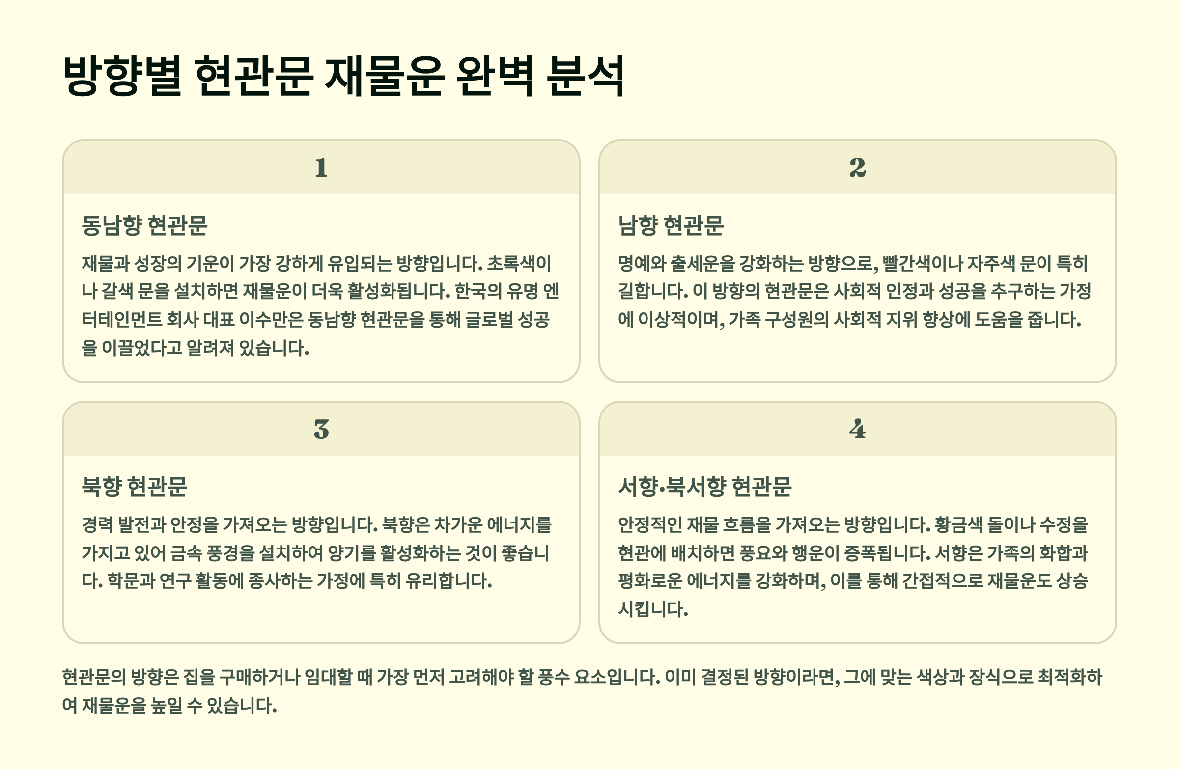 현관문의 방향은 오행(五行) 이론과 밀접한 관련이 있어요. 동쪽은 목(木), 서쪽은 금(金), 남쪽은 화(火), 북쪽은 수(水), 중앙은 토(土)의 기운을 담고 있죠. 각 방향마다 특별한 에너지가 있어서 그에 맞는 인테리어와 소품을 배치하면 재물운을 극대화할 수 있어요. 지금부터 각 방향별로 자세히 알아볼게요!